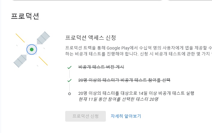 - 프로덕션 액세스 권한을 신청하려면 20명 이상의 테스터가 비공개 테스트에 참여하겠다고 선택해야 하고 이 테스터들은 최근 14일 동안 연속적으로 비공개 테스트에 참여하겠다고 선택한 상태여야 함
