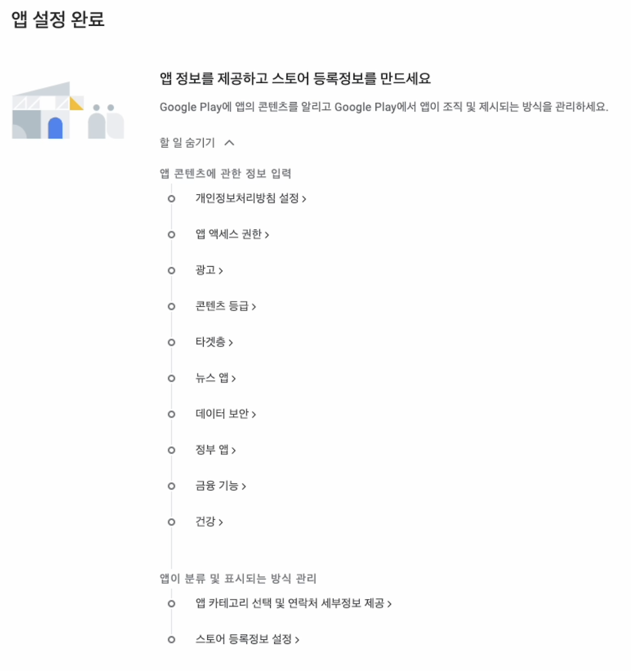 - 앱의 내용에 대한 정보(연령 제한, 콘텐츠 등급, 개인정보처리방침 등)를 입력